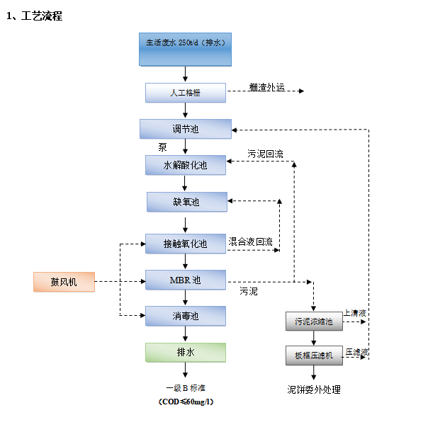 生活污水先經過人工格柵,將大型的懸浮物和物塊隔離出來,剩余的廢水進去調節池,然后加藥進行處理,在經過MBR池處理,處理后的水在經過消毒,就可以達標排放了。